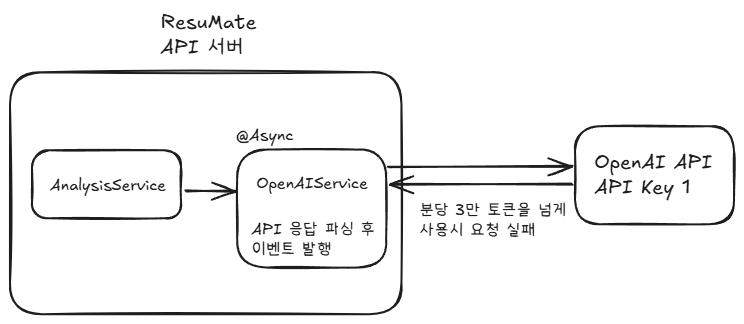 그런데 회고 분석에 사용되는 OpenAI API는 분당 처리 토큰 제한이 존재하였습니다. 이로 인해 1회 분석에 4000 토큰 이상이 소모되는 사용 패턴에 따라 제한을 많이 받을 것으로 판단하였습니다. 실제 개발 과정에서도 토큰 사용량 제한에 걸리기도 하였습니다.