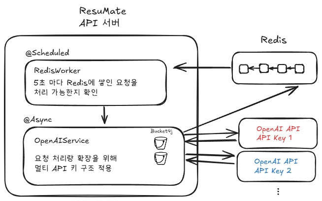 5회 제한을 초과하는 요청은 Redis의 List 자료형을 큐처럼 사용하면서, 제한을 넘어서는 요청을 저장하였습니다. 또, @Scheduled 어노테이션을 이용해 5초마다 큐에 쌓인 요청을 꺼내 처리하도록 구현하였습니다.